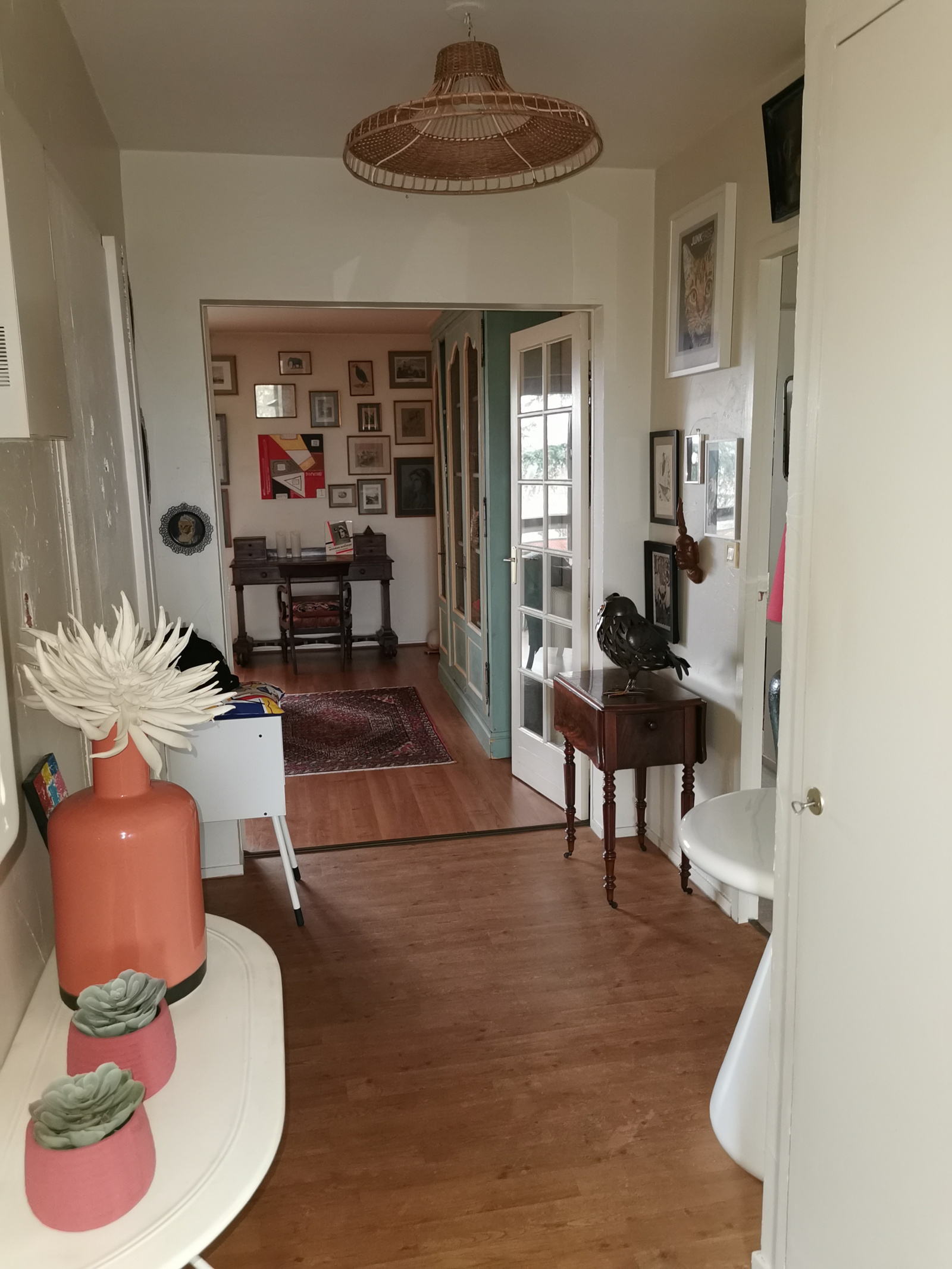 Entrée avec placard, salon / séjour donnant sur un joli balcon de 11 m2 avec vue dégagée orientation Sud , cuisine séparée et équipée avec cellier, 2 chambres , salle de bains, wc avec lave mains .